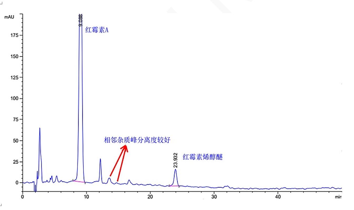 注:該方法要求紅霉素 A 峰與紅霉素烯醇醚峰的分離度應(yīng)大于 14.0,紅霉素 A 峰的拖尾因子應(yīng)小于 2.0。Titank C18 色譜柱分離度可達(dá) 20.19,拖尾因子 0.912,且對(duì)一些相鄰雜質(zhì)峰有更好的分離效果。