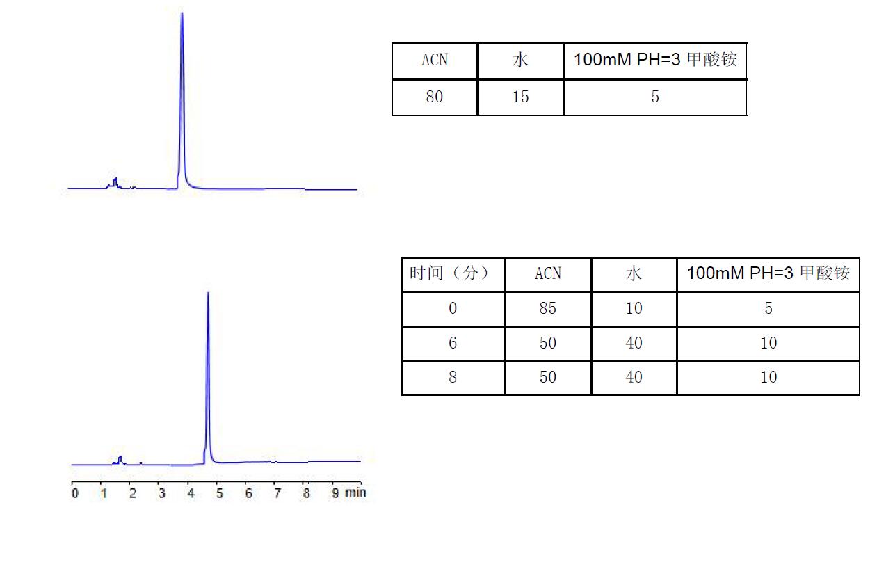說明:以上應(yīng)用可以簡單在酸性體系下分析尼古丁。如果是用于MS 檢測器??蛇x擇Comxsil HAC 3u 50*2.1mm(P/N:FMB-HAC3-BONU)柱,0.2ml/min, ACN:5mM PH=3 甲酸銨=85:15,預(yù)計(jì)2min 出峰分析完畢。 該方法可避免C18 柱酸性條件下的弱保留,拖尾;避免Hilic 柱酸性條件下的重現(xiàn)性問題,避免不喜歡用堿性條件的客戶群體。如果愿意用堿性體系的,菲羅門公司的Titank C18 柱,ACN 與碳酸氫銨的體系,也可以很好分析尼古丁,可向銷售代表索取應(yīng)用。 |